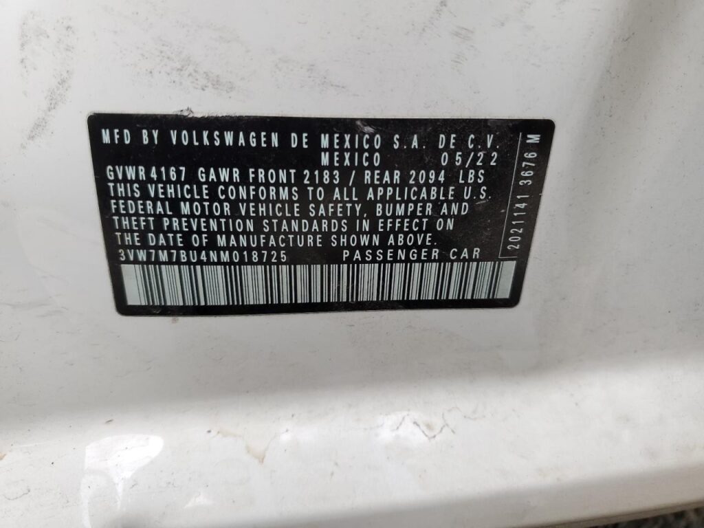 This 2022 VOLKSWAGEN JETTA (WHITE) comes from a major insurance auction in the USA or Canada. All information on this page is linked to the vehicle’s VIN (3VW7M7BU4NM018725), which helps confirm where the car was listed and what condition it was in at the time of sale.