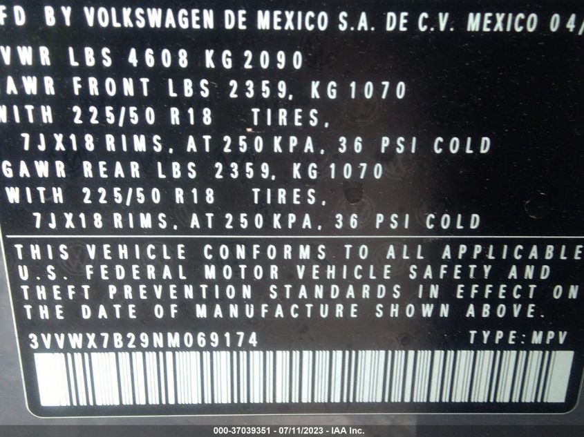 VIN: 3VVWX7B29NM069174