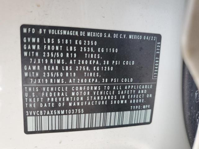 This 2022 Volkswagen Tiguan (White) comes from a major insurance auction in the USA or Canada. All information on this page is linked to the vehicle’s VIN (3VVCB7AX5NM103755), which helps confirm where the car was listed and what condition it was in at the time of sale.