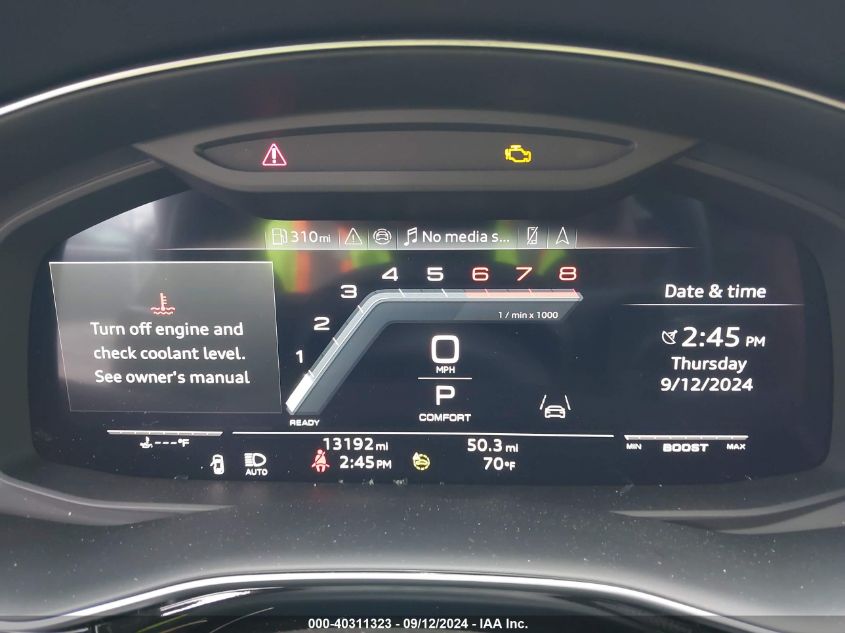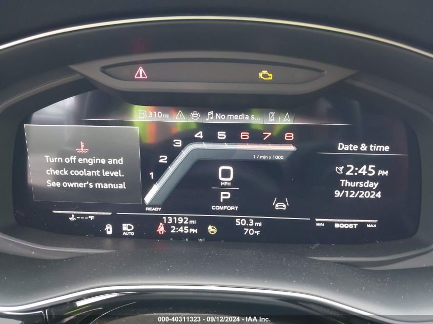 This 2023 AUDI SQ8 (Black) is equipped with an engine designed to balance performance and efficiency. According to the auction listing, the vehicle had 13,192 miles at the time of sale.