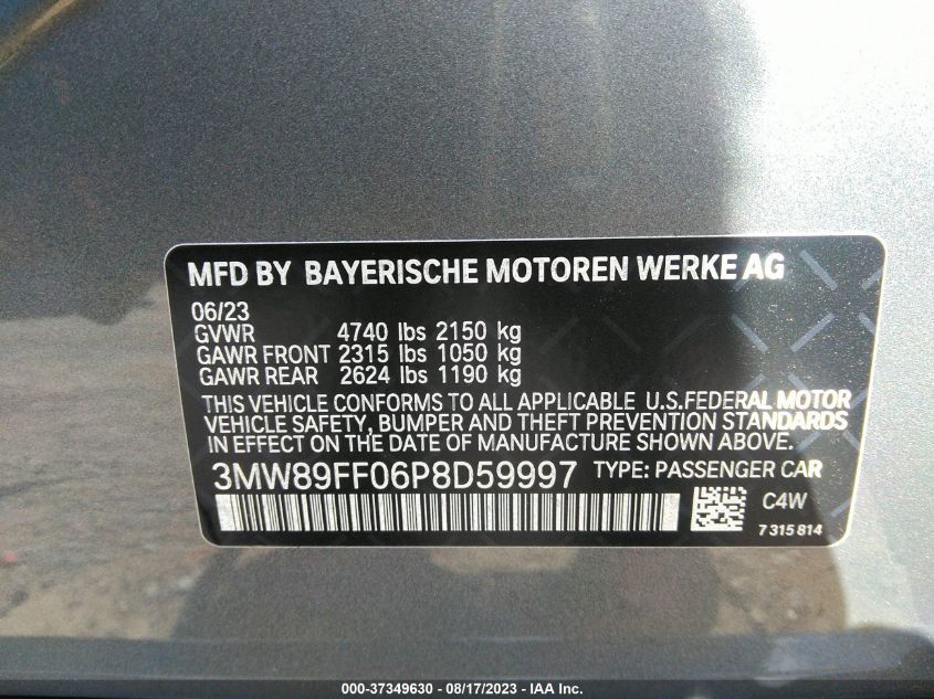 This 2023 BMW 3 Series (Other) comes from a major insurance auction in the USA or Canada. All information on this page is linked to the vehicle’s VIN (3MW89FF06P8D59997), which helps confirm where the car was listed and what condition it was in at the time of sale.