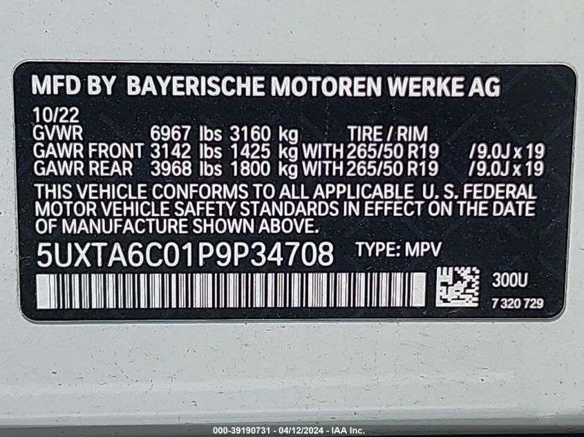 This 2023 BMW X5 (White) comes from a major insurance auction in the USA or Canada. All information on this page is linked to the vehicle’s VIN (5UXTA6C01P9P34708), which helps confirm where the car was listed and what condition it was in at the time of sale.