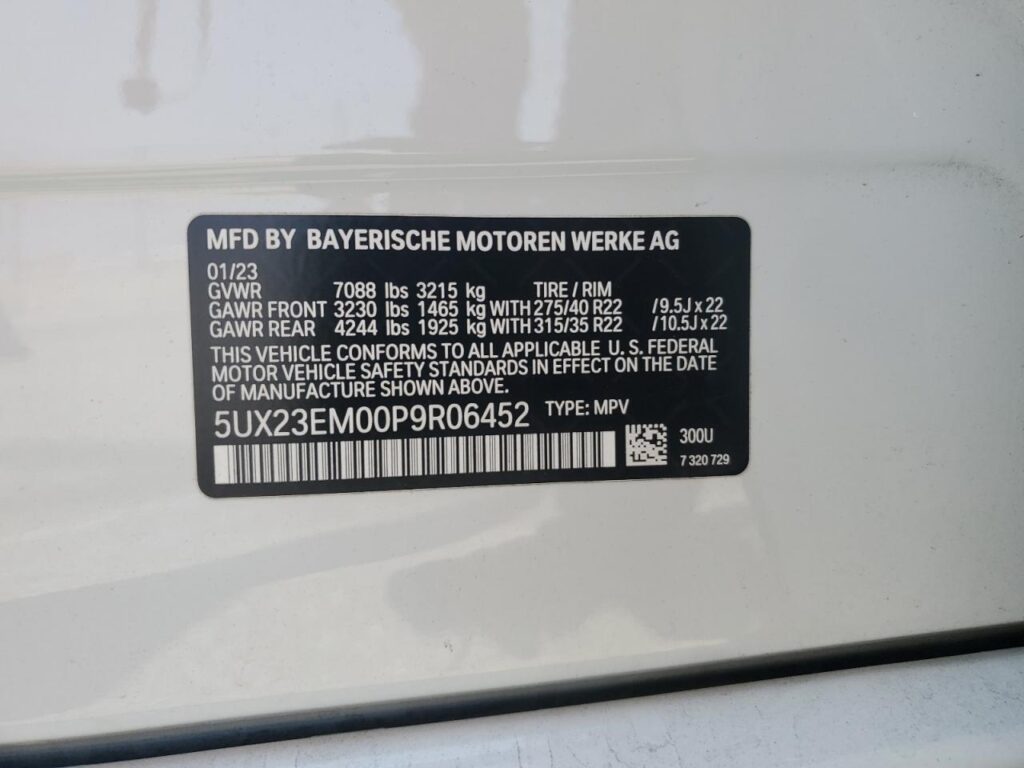 This 2023 BMW X7 (White) comes from a major insurance auction in the USA or Canada. All information on this page is linked to the vehicle’s VIN (5UX23EM00P9R06452), which helps confirm where the car was listed and what condition it was in at the time of sale.