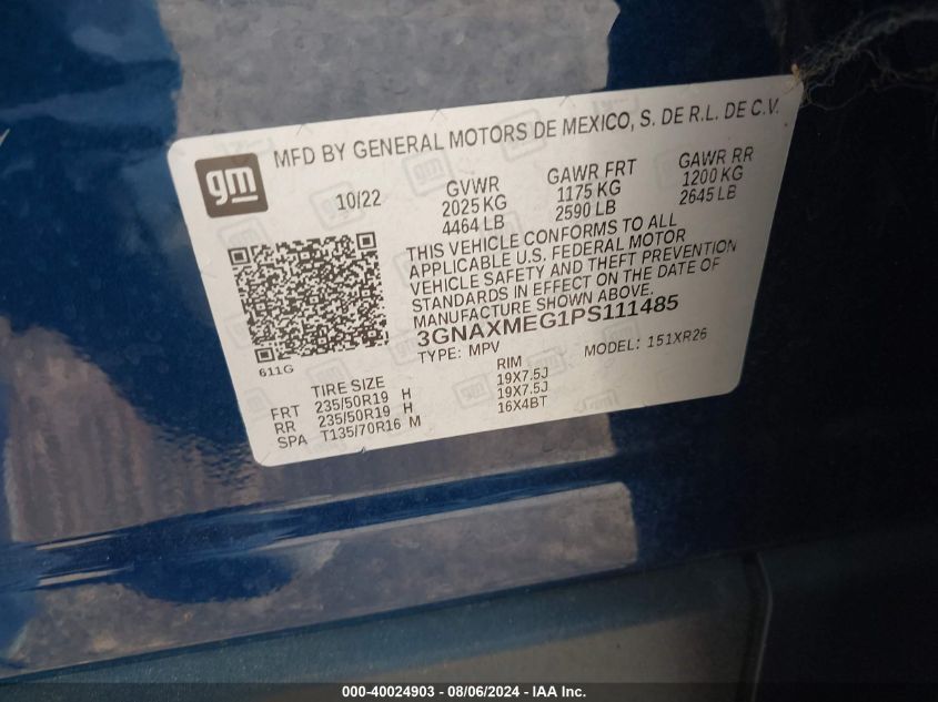 This 2023 CHEVROLET EQUINOX (Unknown Color) comes from a major insurance auction in the USA or Canada. All information on this page is linked to the vehicle’s VIN (3GNAXMEG1PS111485), which helps confirm where the car was listed and what condition it was in at the time of sale.