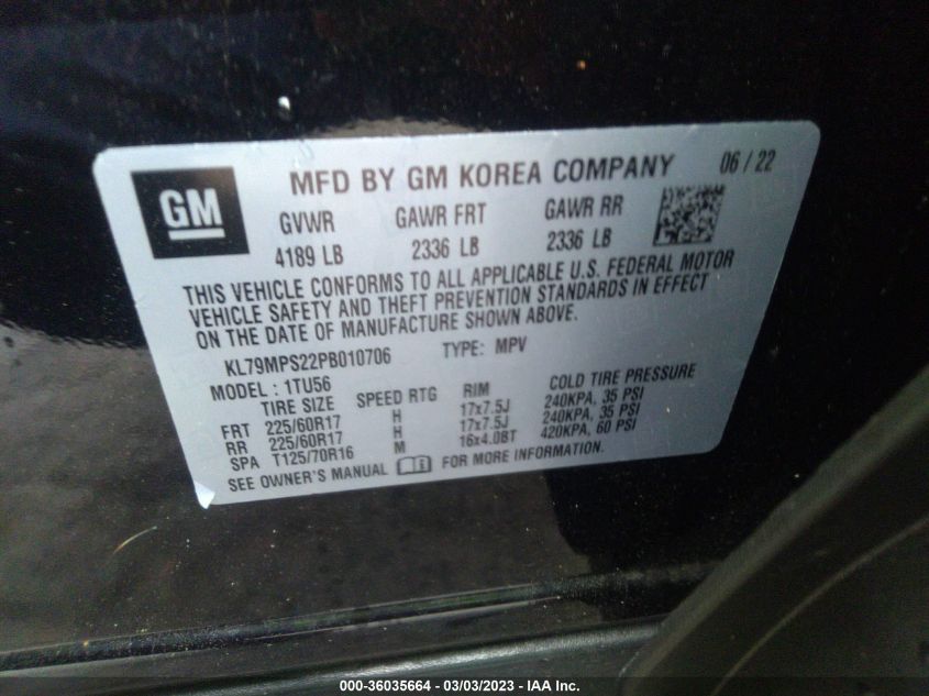 | VIN Number | KL79MPS22PB010706 |