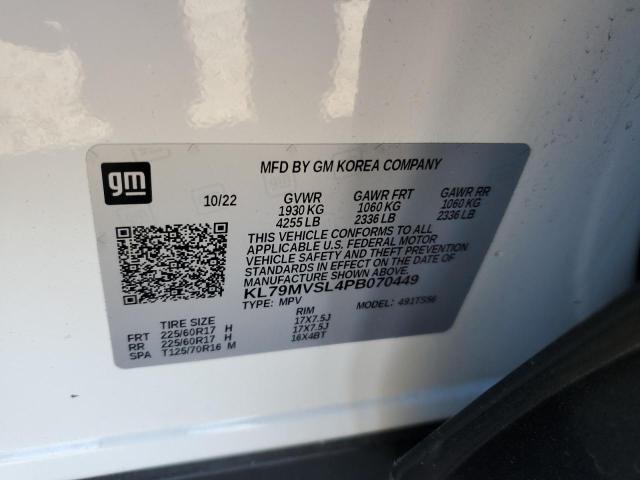 This 2023 CHEVROLET TRAILBLZR (WHITE) comes from a major insurance auction in the USA or Canada. All information on this page is linked to the vehicle’s VIN (KL79MVSL4PB070449), which helps confirm where the car was listed and what condition it was in at the time of sale.