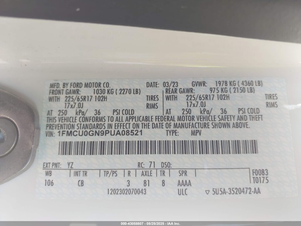 This 2023 Ford Escape (White) comes from a major insurance auction in the USA or Canada. All information on this page is linked to the vehicle’s VIN (1FMCU0GN9PUA08521), which helps confirm where the car was listed and what condition it was in at the time of sale.