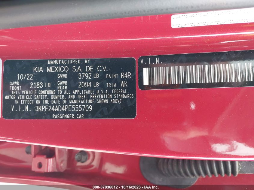 This 2023 Kia Forte (Red) comes from a major insurance auction in the USA or Canada. All information on this page is linked to the vehicle’s VIN (3KPF24AD4PE555709), which helps confirm where the car was listed and what condition it was in at the time of sale.