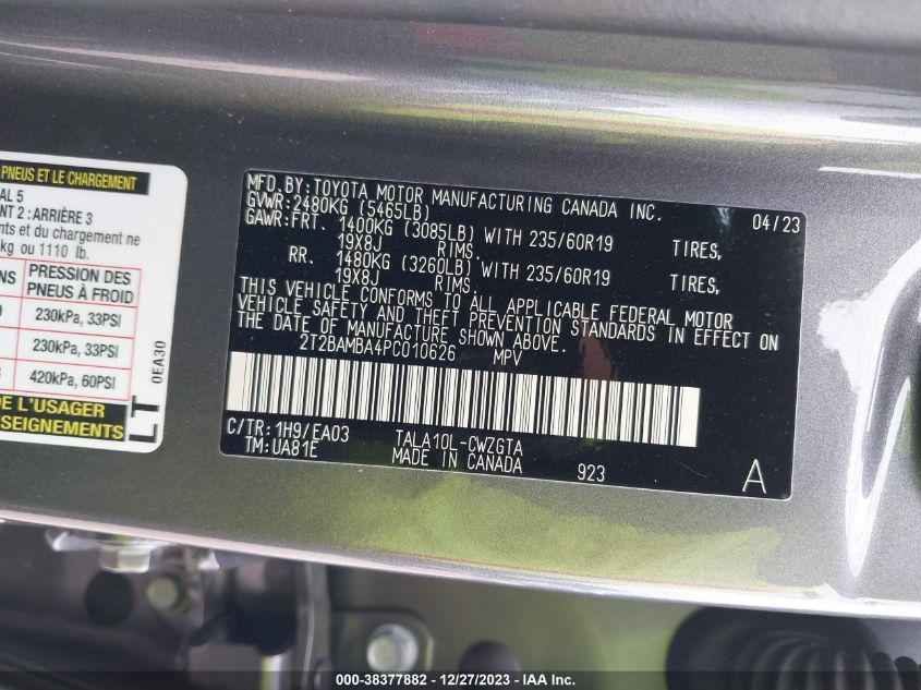 This 2023 Lexus RX 350 (Grey) comes from a major insurance auction in the USA or Canada. All information on this page is linked to the vehicle’s VIN (2T2BAMBA4PC010626), which helps confirm where the car was listed and what condition it was in at the time of sale.