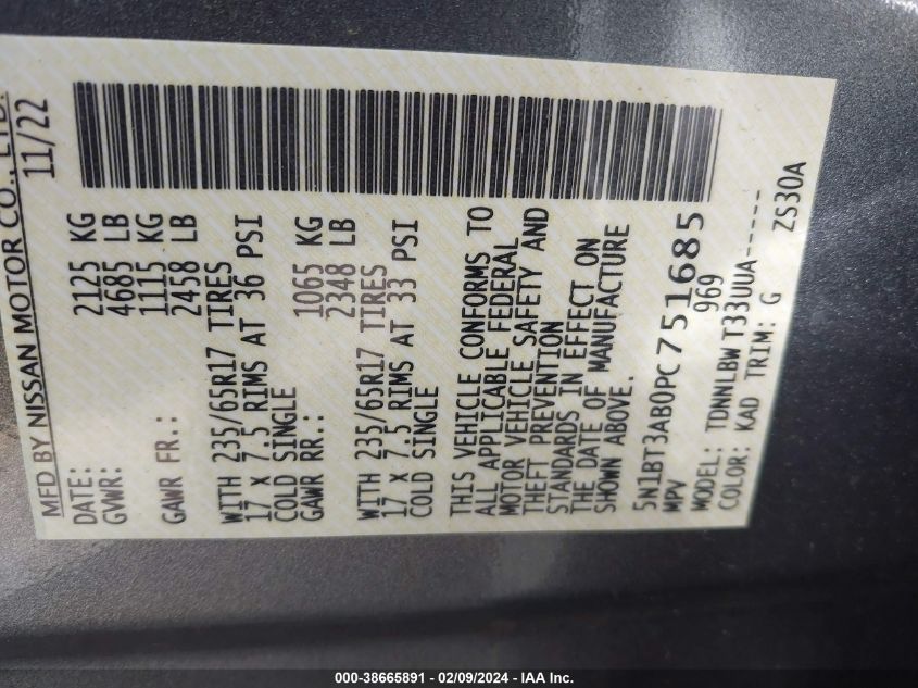 | VIN Number | 5N1BT3AB0PC751685 |