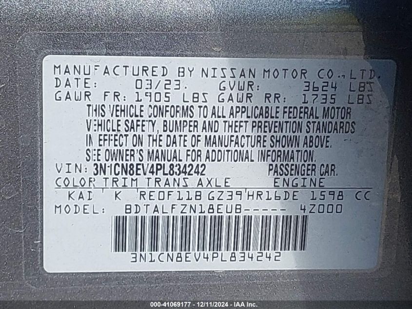 This 2023 NISSAN VERSA (Unknown Color) comes from a major insurance auction in the USA or Canada. All information on this page is linked to the vehicle’s VIN (3N1CN8EV4PL834242), which helps confirm where the car was listed and what condition it was in at the time of sale.