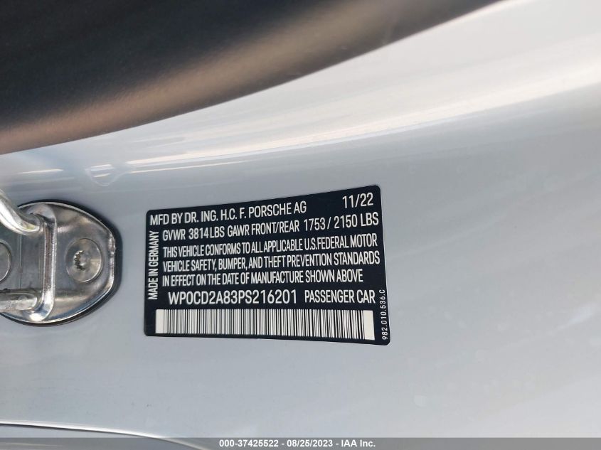 This 2023 Porsche Boxster (White) comes from a major insurance auction in the USA or Canada. All information on this page is linked to the vehicle’s VIN (WP0CD2A83PS216201), which helps confirm where the car was listed and what condition it was in at the time of sale.