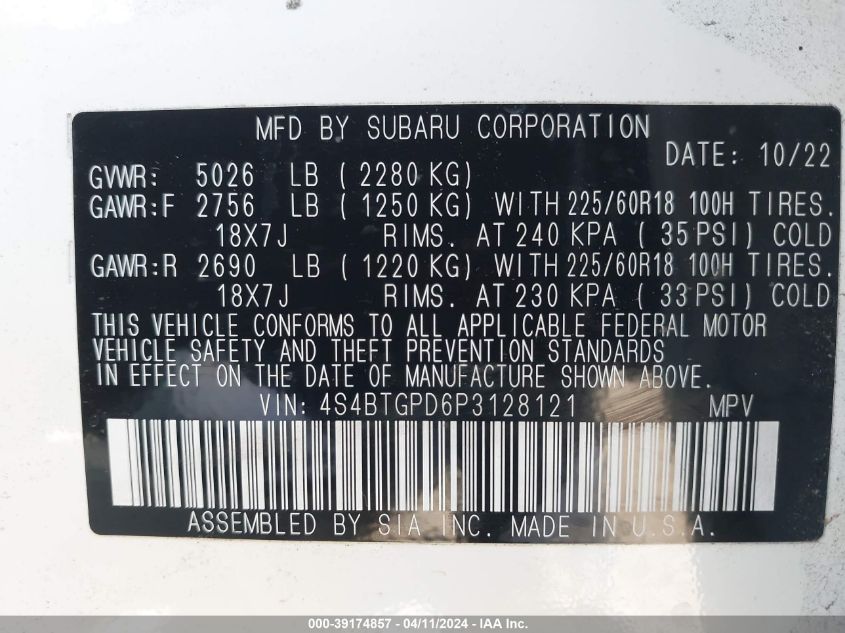 | VIN Number | 4S4BTGPD6P3128121 |