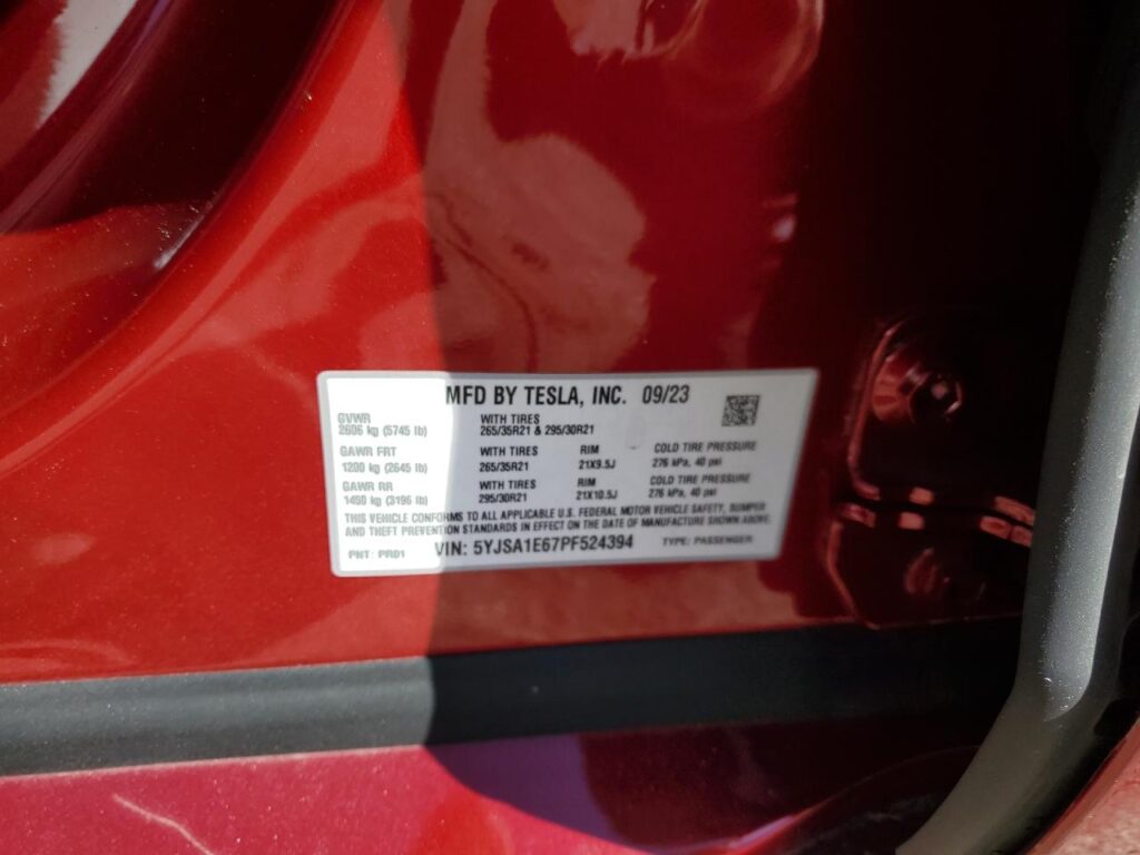 This 2023 Tesla Model S (Red) comes from a major insurance auction in the USA or Canada. All information on this page is linked to the vehicle’s VIN (5YJSA1E67PF524394), which helps confirm where the car was listed and what condition it was in at the time of sale.