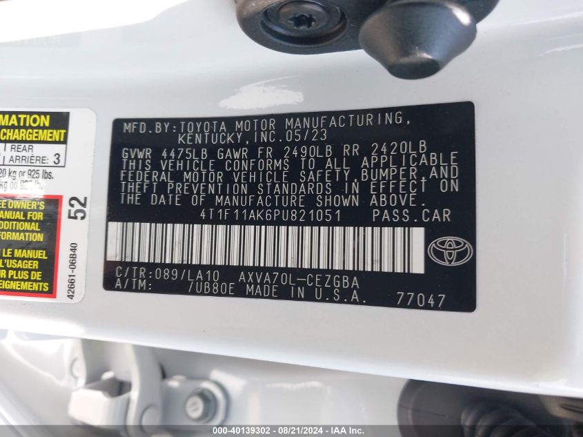 | VIN Number | 4T1F11AK6PU821051 |