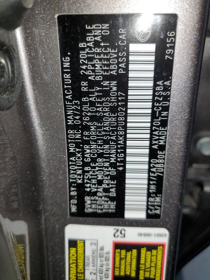 This 2023 Toyota Camry (Charcoal) comes from a major insurance auction in the USA or Canada. All information on this page is linked to the vehicle’s VIN (4T1G11AK8PU802117), which helps confirm where the car was listed and what condition it was in at the time of sale.