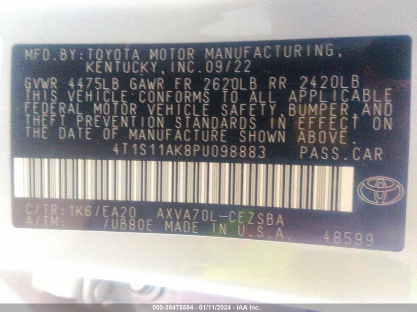 | VIN Number | 4T1S11AK8PU098883 |