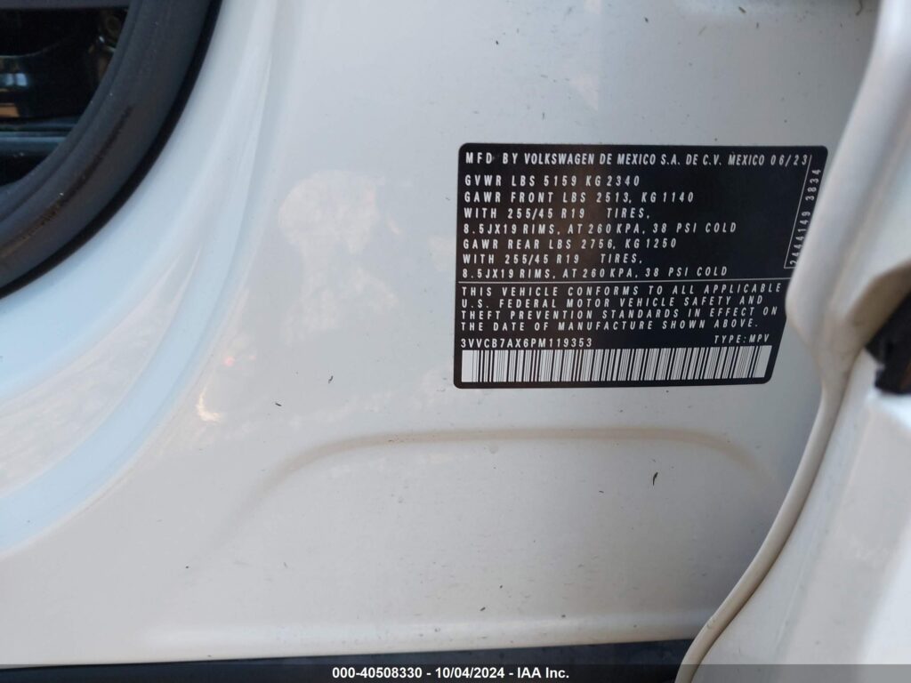 This 2023 Volkswagen Tiguan (White) comes from a major insurance auction in the USA or Canada. All information on this page is linked to the vehicle’s VIN (3VVCB7AX6PM119353), which helps confirm where the car was listed and what condition it was in at the time of sale.