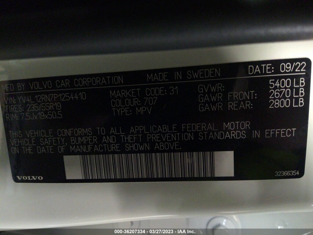 This 2023 Volvo XC60 (White) comes from a major insurance auction in the USA or Canada. All information on this page is linked to the vehicle’s VIN (YV4L12RN7P1254410), which helps confirm where the car was listed and what condition it was in at the time of sale.