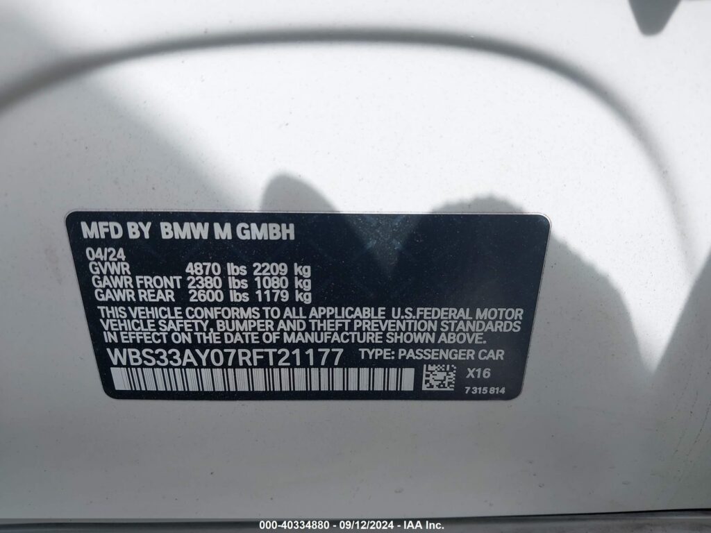 This 2024 BMW M3 (White) comes from a major insurance auction in the USA or Canada. All information on this page is linked to the vehicle’s VIN (WBS33AY07RFT21177), which helps confirm where the car was listed and what condition it was in at the time of sale.