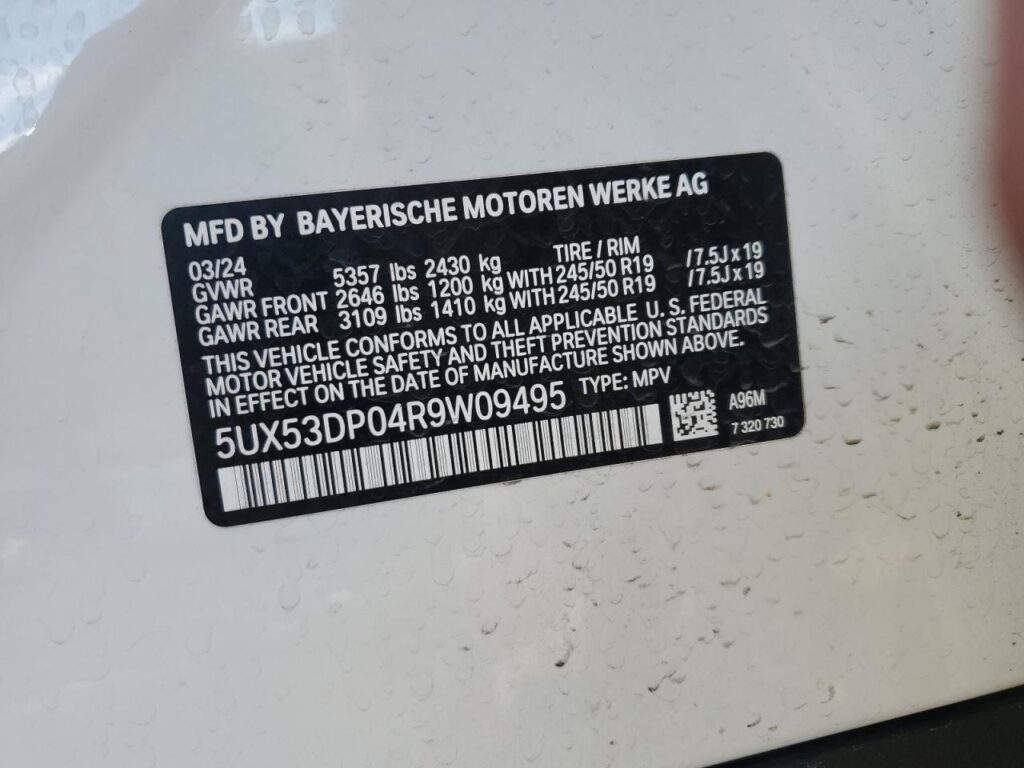 This 2024 BMW X3 (WHITE) comes from a major insurance auction in the USA or Canada. All information on this page is linked to the vehicle’s VIN (5UX53DP04R9W09495), which helps confirm where the car was listed and what condition it was in at the time of sale.