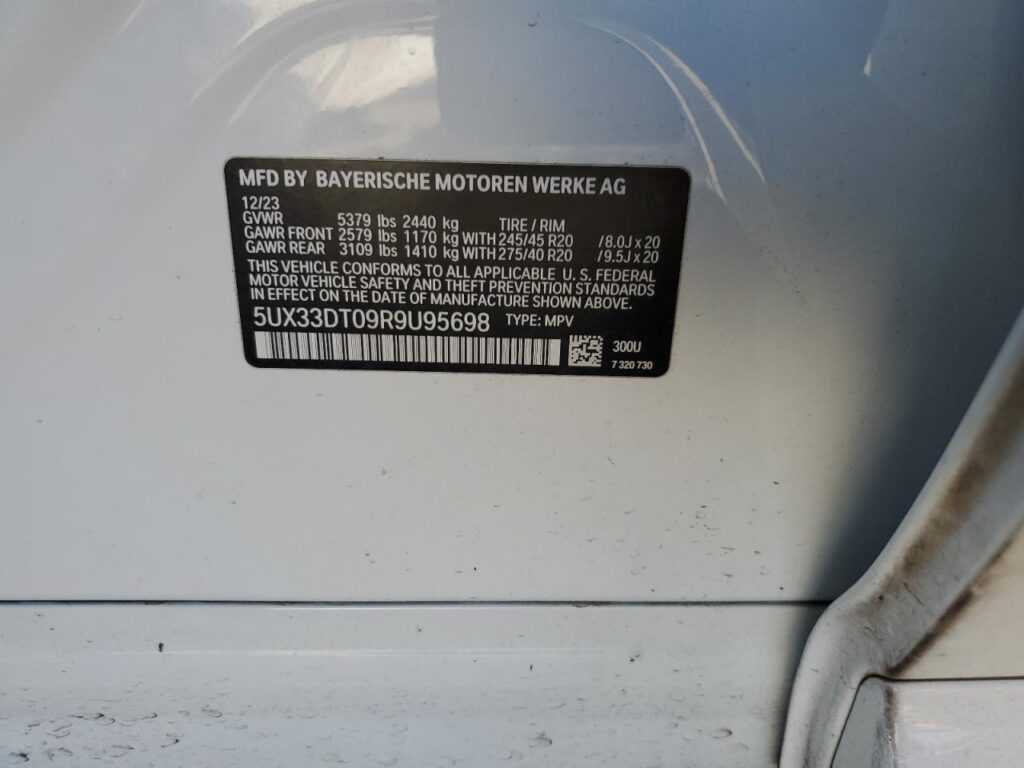 This 2024 BMW X4 (WHITE) comes from a major insurance auction in the USA or Canada. All information on this page is linked to the vehicle’s VIN (5UX33DT09R9U95698), which helps confirm where the car was listed and what condition it was in at the time of sale.
