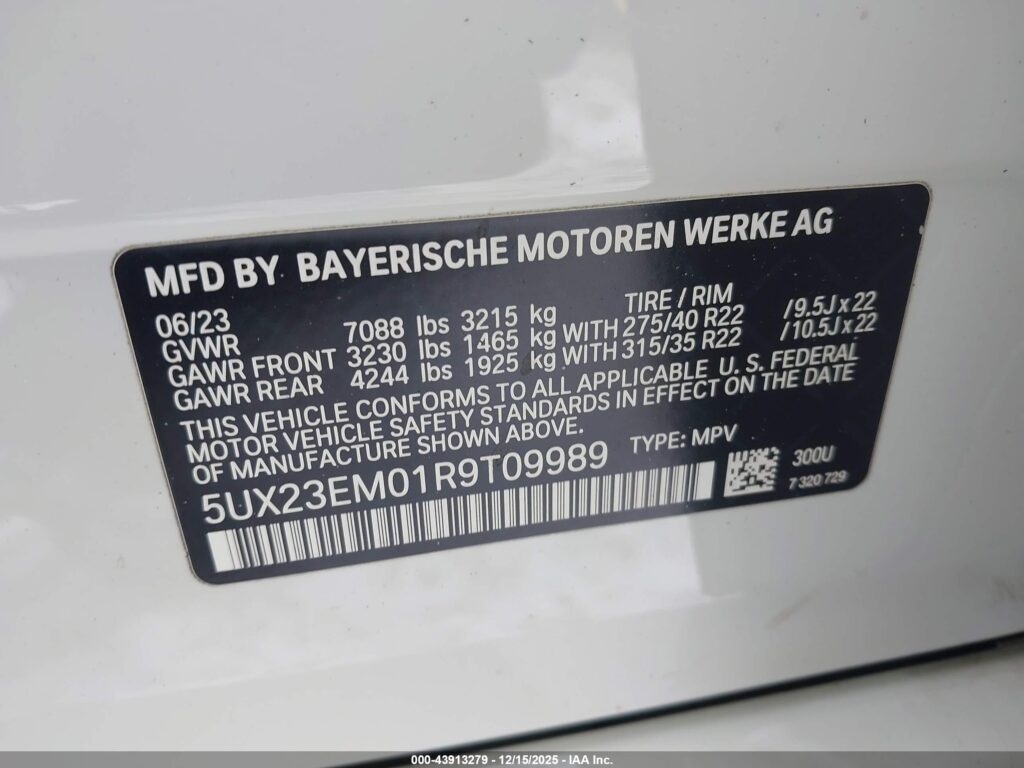 This 2024 BMW X7 (White) comes from a major insurance auction in the USA or Canada. All information on this page is linked to the vehicle’s VIN (5UX23EM01R9T09989), which helps confirm where the car was listed and what condition it was in at the time of sale.