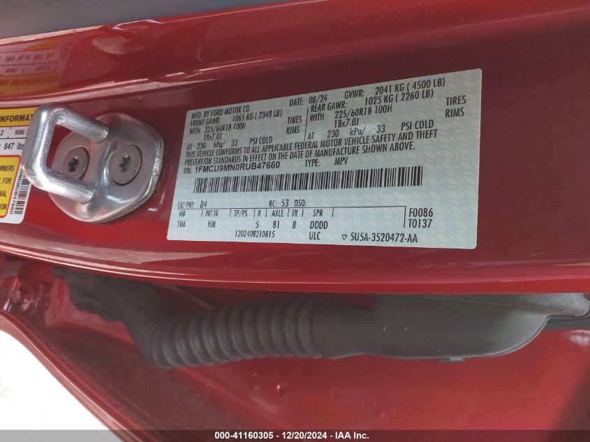 This 2024 FORD ESCAPE (Red) comes from a major insurance auction in the USA or Canada. All information on this page is linked to the vehicle’s VIN (1FMCU9MN0RUB47660), which helps confirm where the car was listed and what condition it was in at the time of sale.