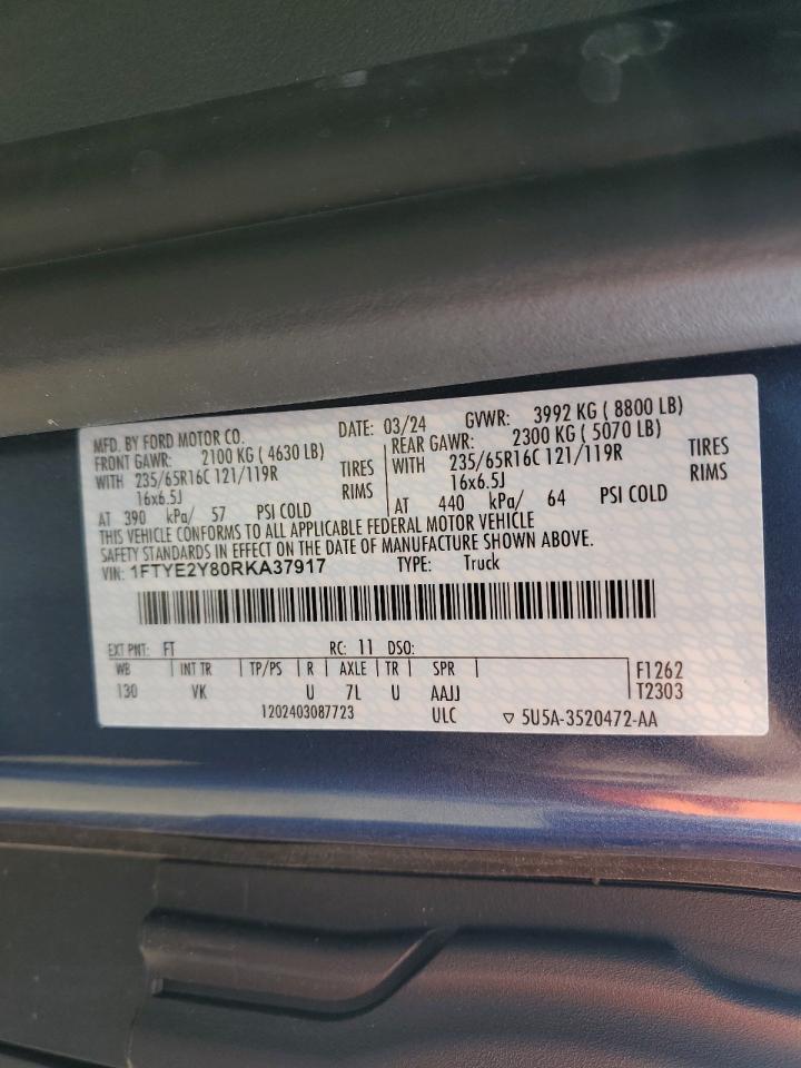 This 2024 Ford Transit (Blue) comes from a major insurance auction in the USA or Canada. All information on this page is linked to the vehicle’s VIN (1FTYE2Y80RKA37917), which helps confirm where the car was listed and what condition it was in at the time of sale.