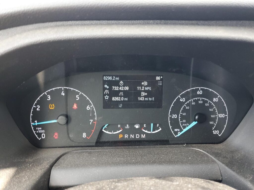 This 2024 Ford Transit (Blue) is equipped with an engine designed to balance performance and efficiency. According to the auction listing, the vehicle had 8,296 miles at the time of sale.