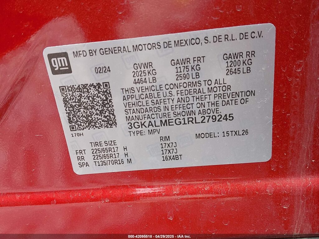 This 2024 GMC Terrain (Red) comes from a major insurance auction in the USA or Canada. All information on this page is linked to the vehicle’s VIN (3GKALMEG1RL279245), which helps confirm where the car was listed and what condition it was in at the time of sale.