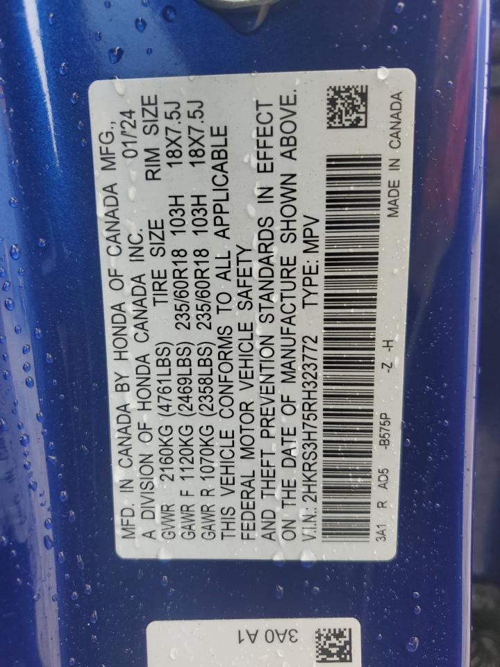 This 2024 Honda CR-V (Blue) comes from a major insurance auction in the USA or Canada. All information on this page is linked to the vehicle’s VIN (2HKRS3H75RH323772), which helps confirm where the car was listed and what condition it was in at the time of sale.