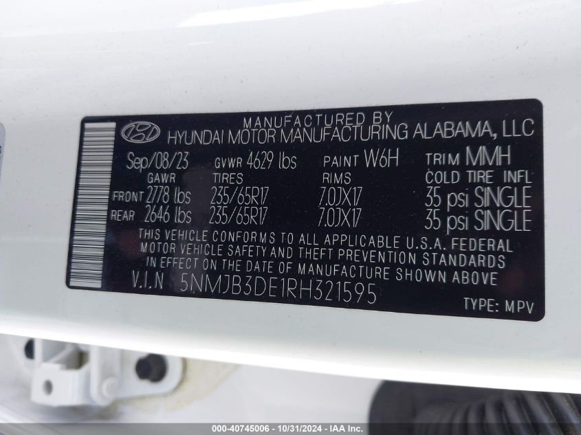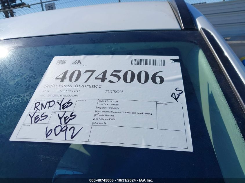This 2024 HYUNDAI TUCSON (White) comes from a major insurance auction in the USA or Canada. All information on this page is linked to the vehicle’s VIN (5NMJB3DE1RH321595), which helps confirm where the car was listed and what condition it was in at the time of sale.