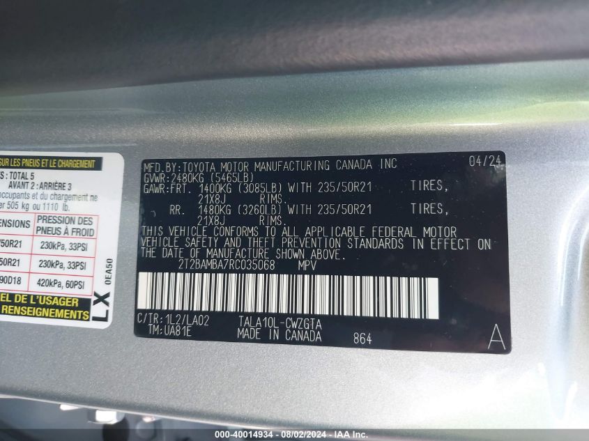 This 2024 LEXUS RX (Unknown Color) comes from a major insurance auction in the USA or Canada. All information on this page is linked to the vehicle’s VIN (2T2BAMBA7RC035068), which helps confirm where the car was listed and what condition it was in at the time of sale.