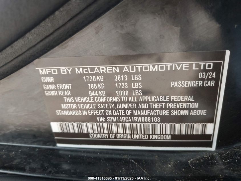 This 2024 MCLAREN 750S (Black) comes from a major insurance auction in the USA or Canada. All information on this page is linked to the vehicle’s VIN (SBM14BCA1RW008103), which helps confirm where the car was listed and what condition it was in at the time of sale.