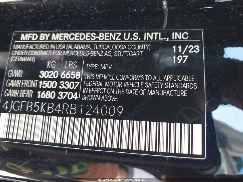 This 2024 MERCEDES-BENZ GLE (Unknown Color) comes from a major insurance auction in the USA or Canada. All information on this page is linked to the vehicle’s VIN (4JGFB5KB4RB124009), which helps confirm where the car was listed and what condition it was in at the time of sale.