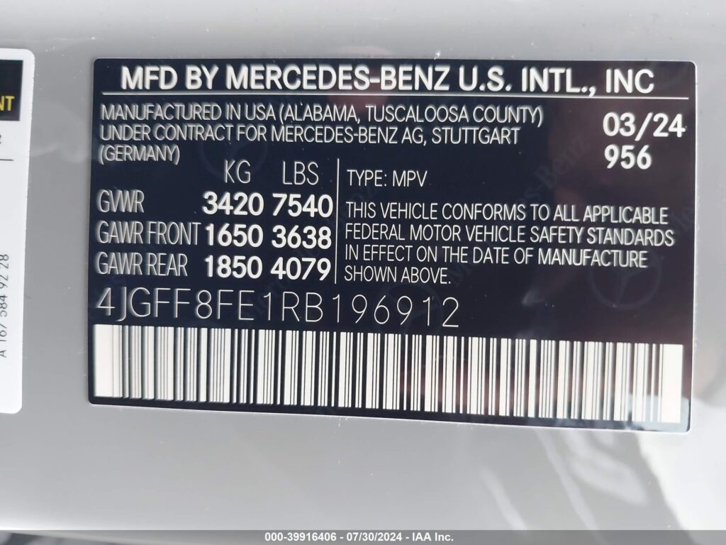 This 2024 Mercedes-Benz GLS-Class (Other) comes from a major insurance auction in the USA or Canada. All information on this page is linked to the vehicle’s VIN (4JGFF8FE1RB196912), which helps confirm where the car was listed and what condition it was in at the time of sale.