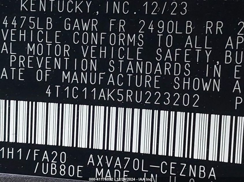 | VIN Number | 4T1C11AK5RU223202 |