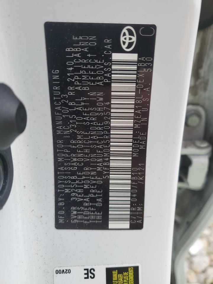 This 2024 Toyota Corolla (White) comes from a major insurance auction in the USA or Canada. All information on this page is linked to the vehicle’s VIN (5YFB4MDE5RP092574), which helps confirm where the car was listed and what condition it was in at the time of sale.