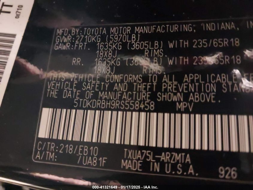 | VIN Number | 5TDKDRBH9RS558458 |