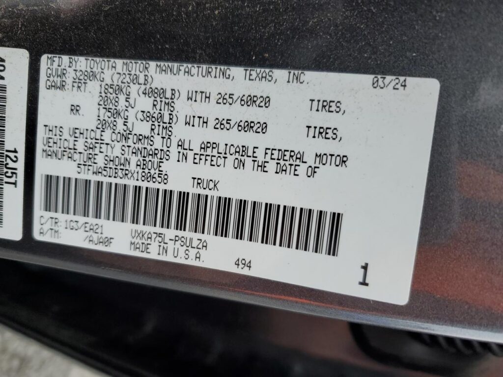 This 2024 TOYOTA TUNDRA (CHARCOAL) comes from a major insurance auction in the USA or Canada. All information on this page is linked to the vehicle’s VIN (5TFWA5DB3RX180658), which helps confirm where the car was listed and what condition it was in at the time of sale.
