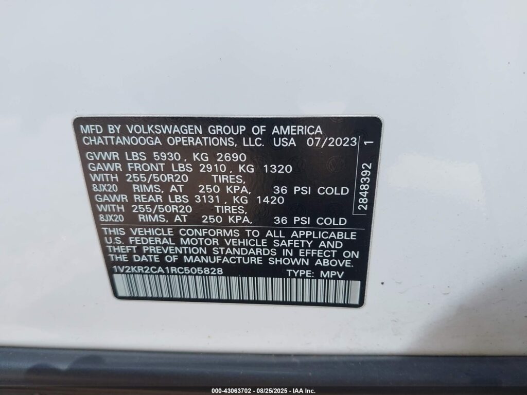 This 2024 Volkswagen Atlas (White) comes from a major insurance auction in the USA or Canada. All information on this page is linked to the vehicle’s VIN (1V2KR2CA1RC505828), which helps confirm where the car was listed and what condition it was in at the time of sale.
