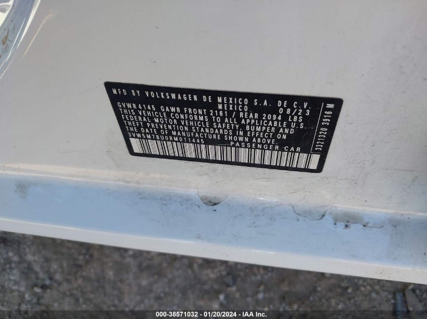 This 2024 Volkswagen Jetta (White) comes from a major insurance auction in the USA or Canada. All information on this page is linked to the vehicle’s VIN (3VW5M7BU0RM011445), which helps confirm where the car was listed and what condition it was in at the time of sale.