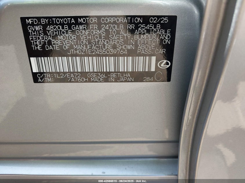 This 2025 Lexus IS 350 (Silver) comes from a major insurance auction in the USA or Canada. All information on this page is linked to the vehicle’s VIN (JTHGZ1E24S5039764), which helps confirm where the car was listed and what condition it was in at the time of sale.