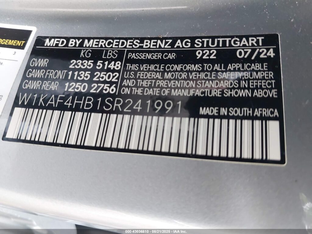 This 2025 Mercedes-Benz C-Class (Silver) comes from a major insurance auction in the USA or Canada. All information on this page is linked to the vehicle’s VIN (W1KAF4HB1SR241991), which helps confirm where the car was listed and what condition it was in at the time of sale.