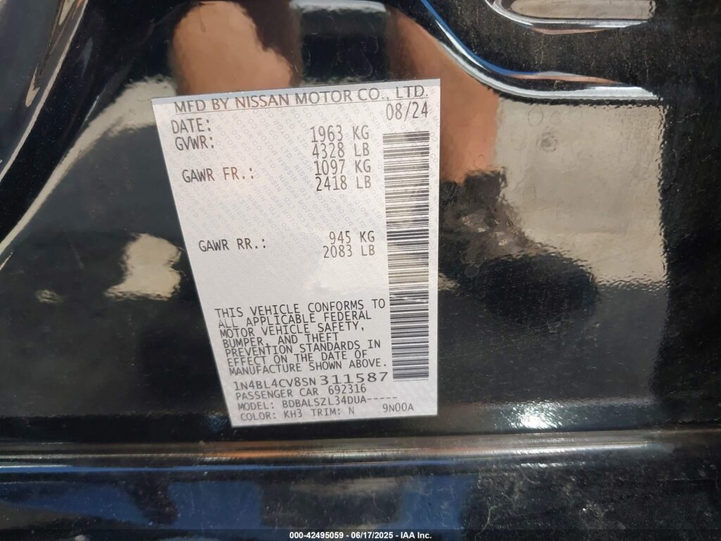 This 2025 Nissan Altima (Black) comes from a major insurance auction in the USA or Canada. All information on this page is linked to the vehicle’s VIN (1N4BL4CV8SN311587), which helps confirm where the car was listed and what condition it was in at the time of sale.