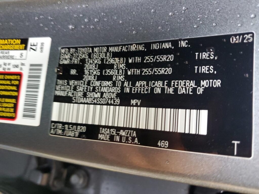 This 2025 Toyota Highlander (Grey) comes from a major insurance auction in the USA or Canada. All information on this page is linked to the vehicle’s VIN (5TDAAAB54SS074439), which helps confirm where the car was listed and what condition it was in at the time of sale.